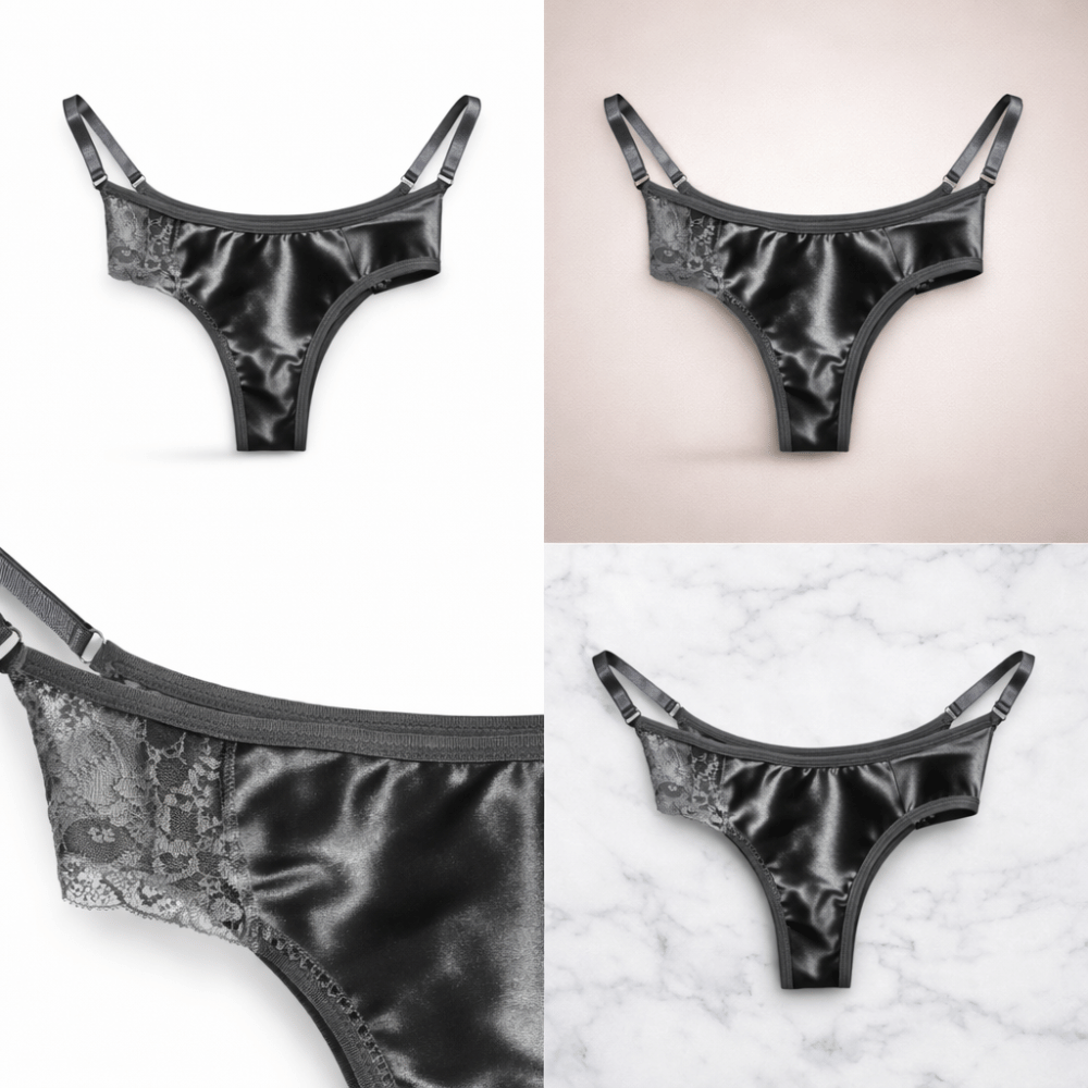 Elegant black satin thong panty featuring delicate lace side panels and adjustable straps for a stylish and comfortable fit.