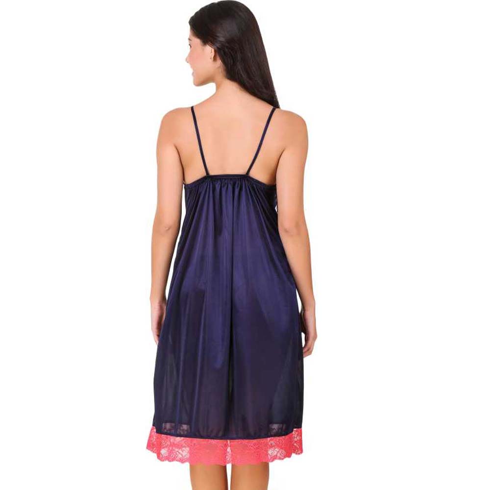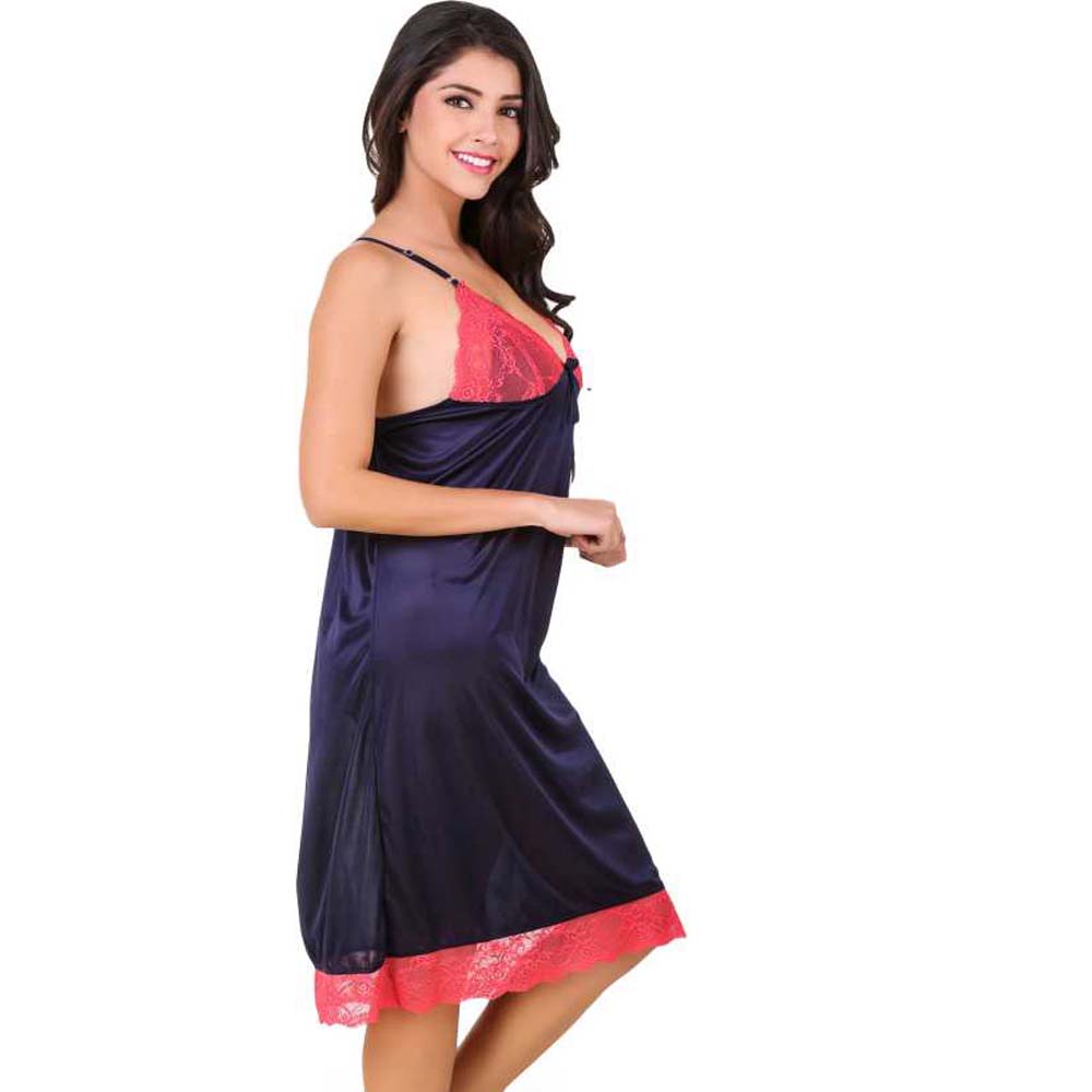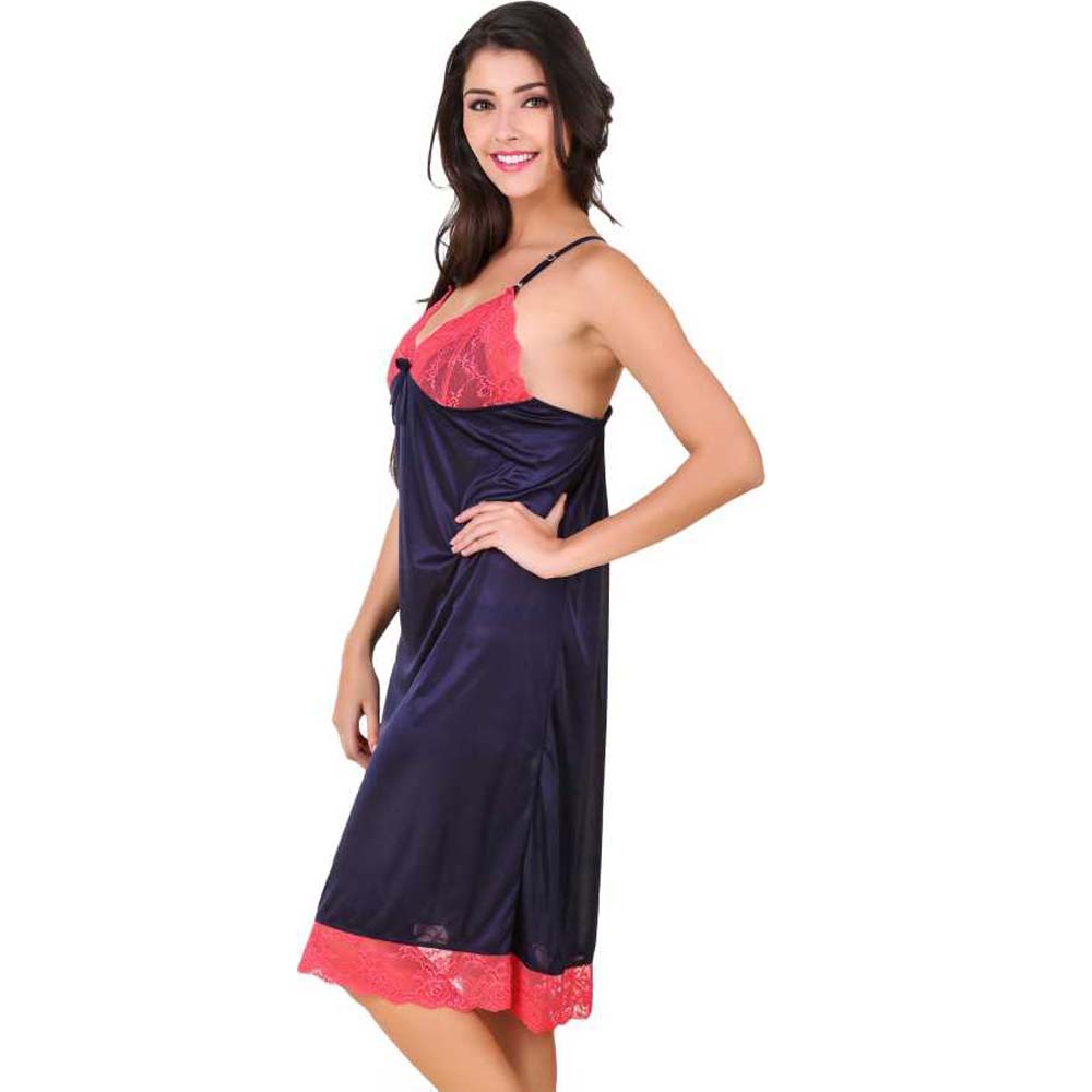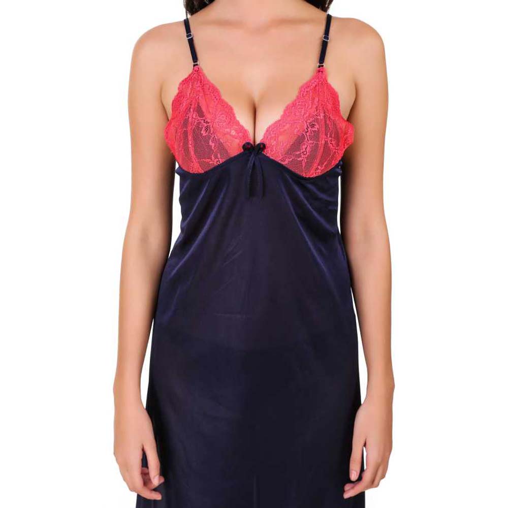 Add some color to your nights with this Comfort Fit Pink Lace Royal Blue Nighty Sleepwear . It is super comfortable to wear. Easy to slip on for a sophisticated elegant evening. The fabric slides smooth on your skin heightening sensitivity & the side slits let you move freely. The lurex threads woven in the lace add a hint of subtle shimmer complementing the pretty trinket at the front. It's perfect for your wedding night or honeymoon. The cute big satin pink bows looks very beautiful and awesome. This Comfort Fit Pink Lace Royal Blue Nighty Sleepwear is perfect for a romantic night. It has gorgeous sheer floral lace cups that will show the perfect amount of skin.Important Features