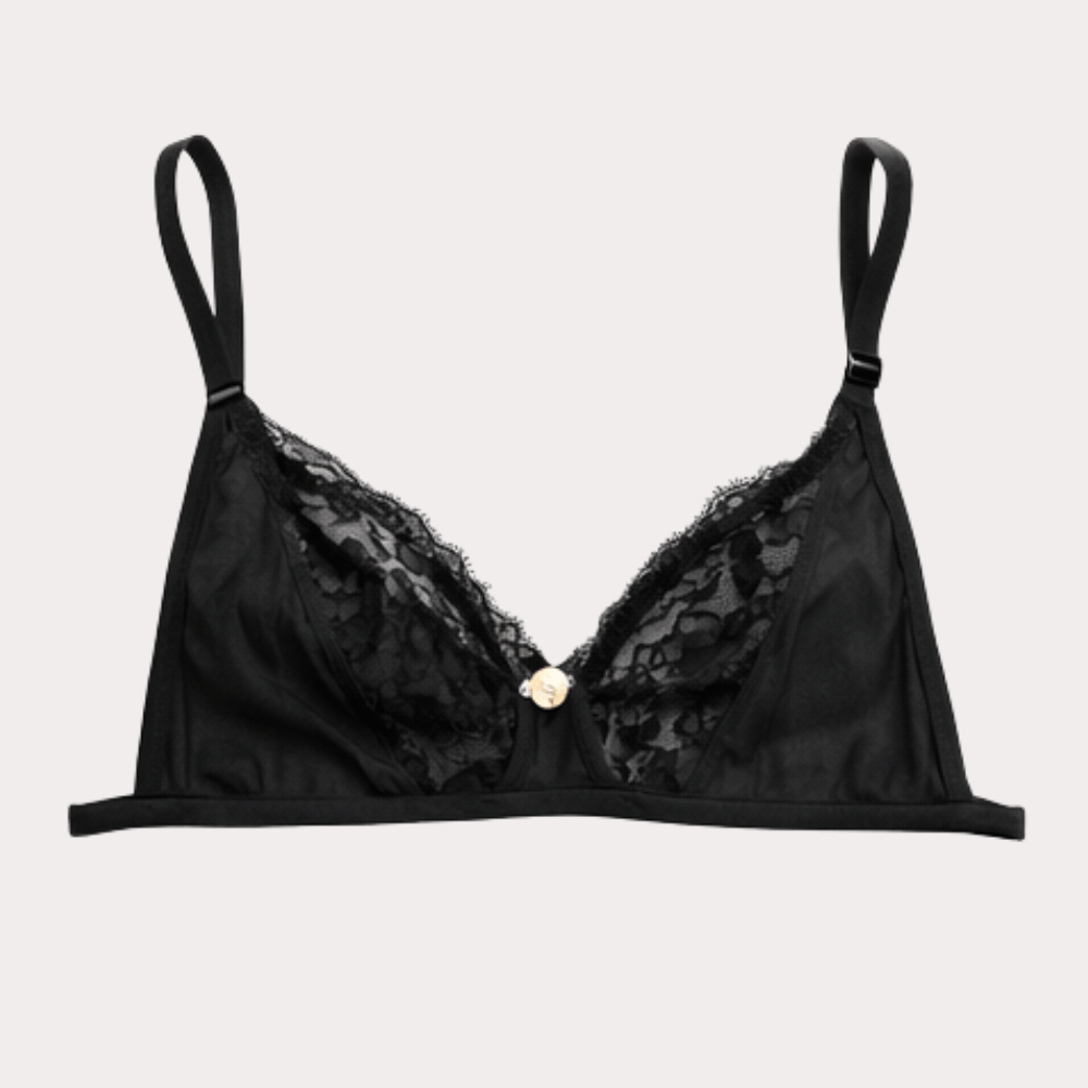 Black lace triangle bralette with sheer mesh cups and elegant gold charm detail. Lightweight, comfortable, and perfect for everyday luxury.