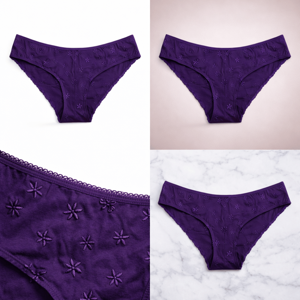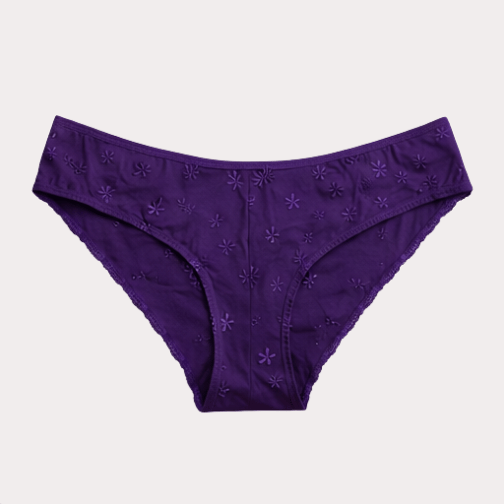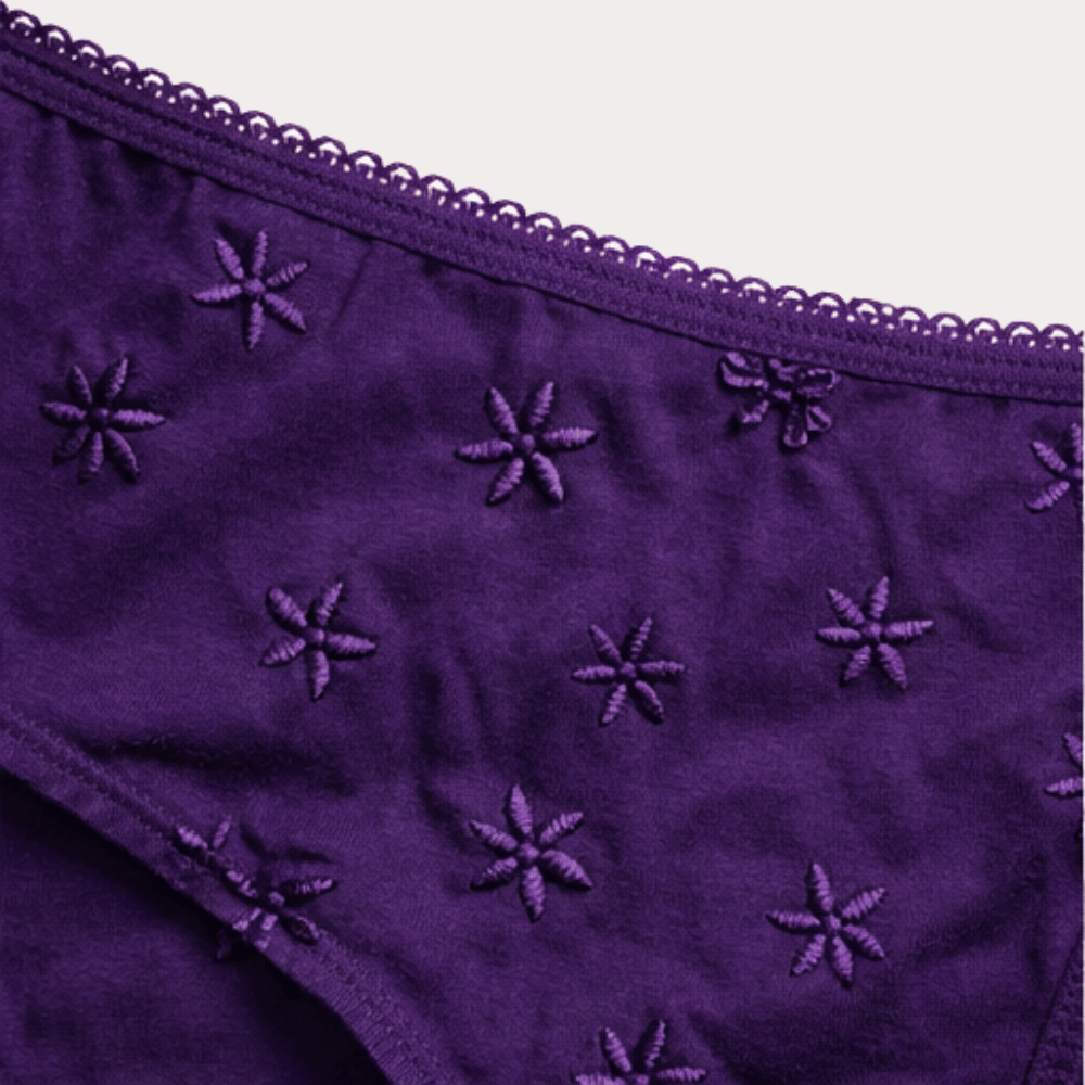 Soft purple cotton panty featuring delicate embroidered floral star motifs and comfortable lace-trim edges for everyday wear.