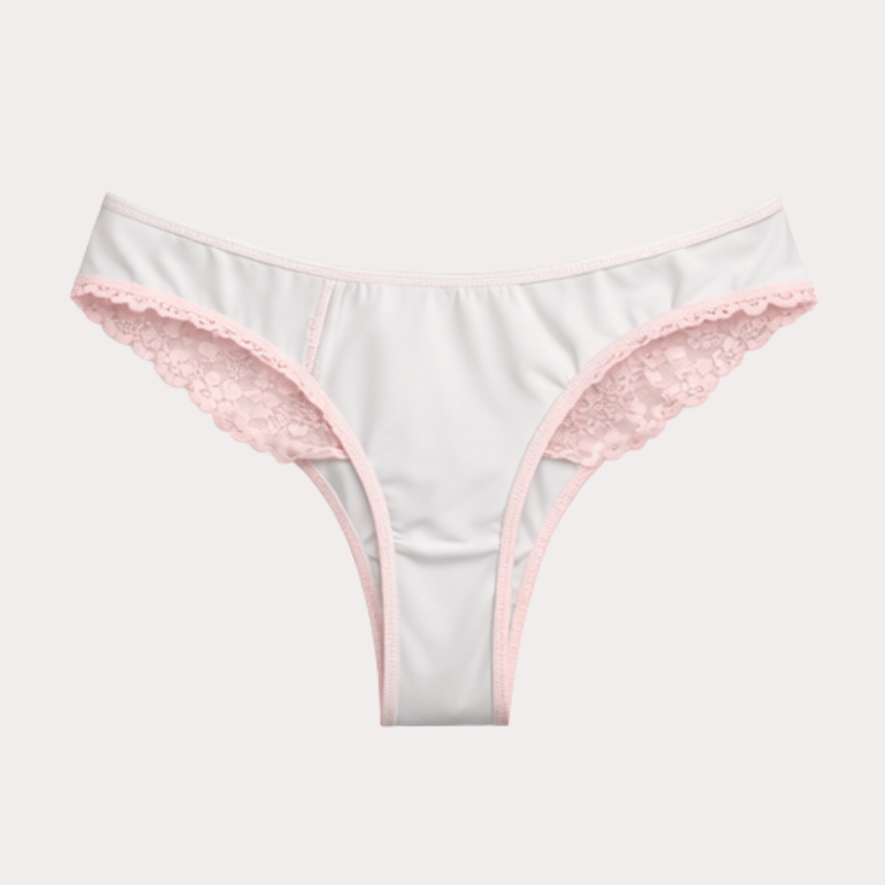White panty with delicate blush pink lace trim, featuring soft breathable fabric and elegant scalloped lace edges for a comfortable feminine fit.