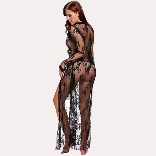This robe is made of a luxurious black material that is see-through, and it falls gently over your body, showing off your natural beauty. The elaborate floral lace trim decorates the edges in a delicate way, adding to the overall beauty with its classic elegance. The Floral Lace-Trimmed Black Transparent Robe offers a luxurious and sensual experience, whether you put it on to spark a romantic flame or to treat yourself to a moment of self-pampering.