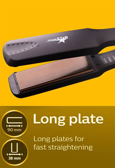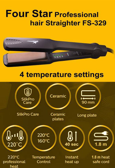 Ideal Four Star FS-329 Hair Straightener is dedicated to helping women achieve beautiful hair they'll love! Whether women desire gorgeous blowouts, big enviable waves, striking straight locks, or the perfect fashion accessory to complete the look, FS-329 has the styling tools you desire. Quick and Smooth Results with this easy-to-use flat iron designed for creating the latest hair trends in all hair types. Ceramic-coated plates help protect hair from over-styling with even heat distribution that penetrates and styles from the inside out for smooth, shiny results. With 40W high heat for fast styling and with silicone finger grips make it comfortable and effortless.Important Features