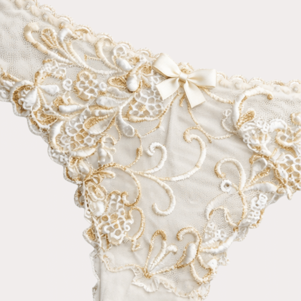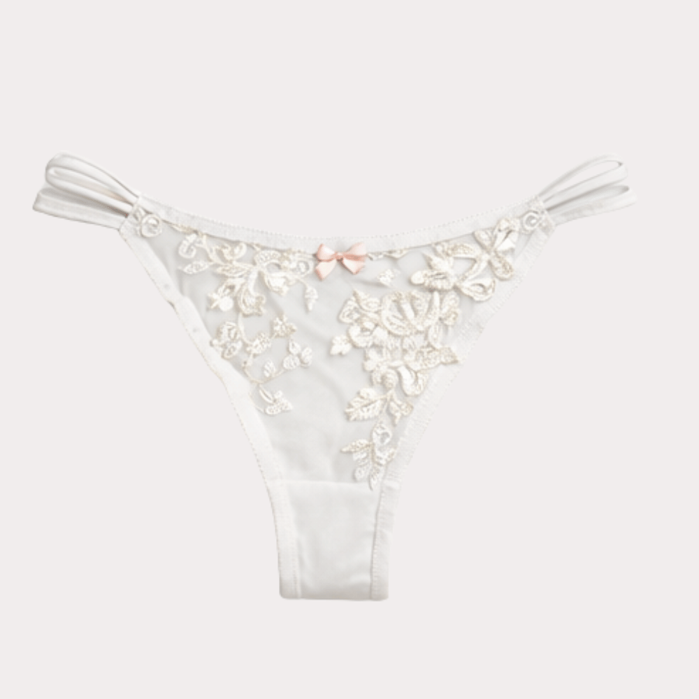 Elegant ivory lace panty featuring delicate floral embroidery, sheer mesh fabric, and a satin bow for a luxurious feminine look.