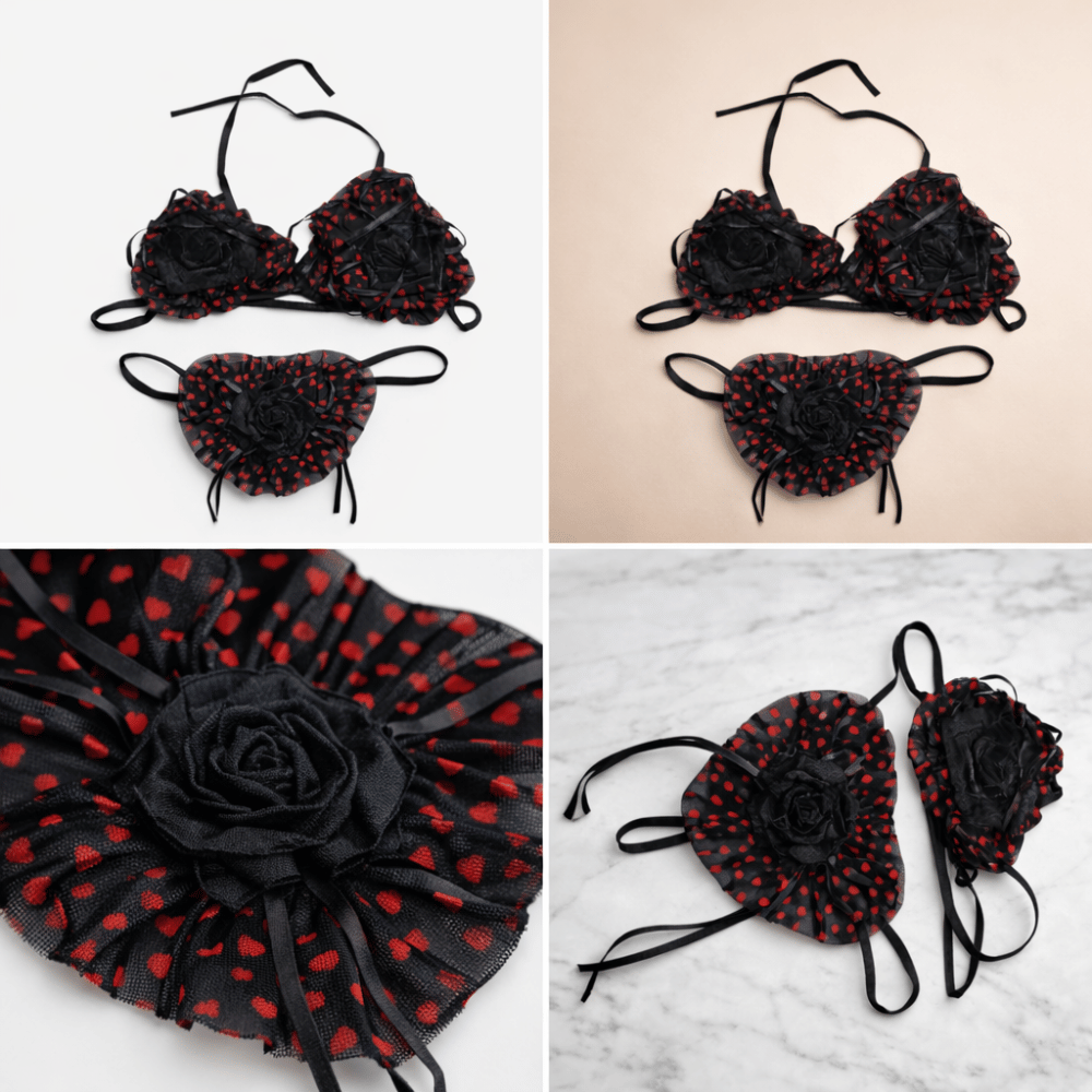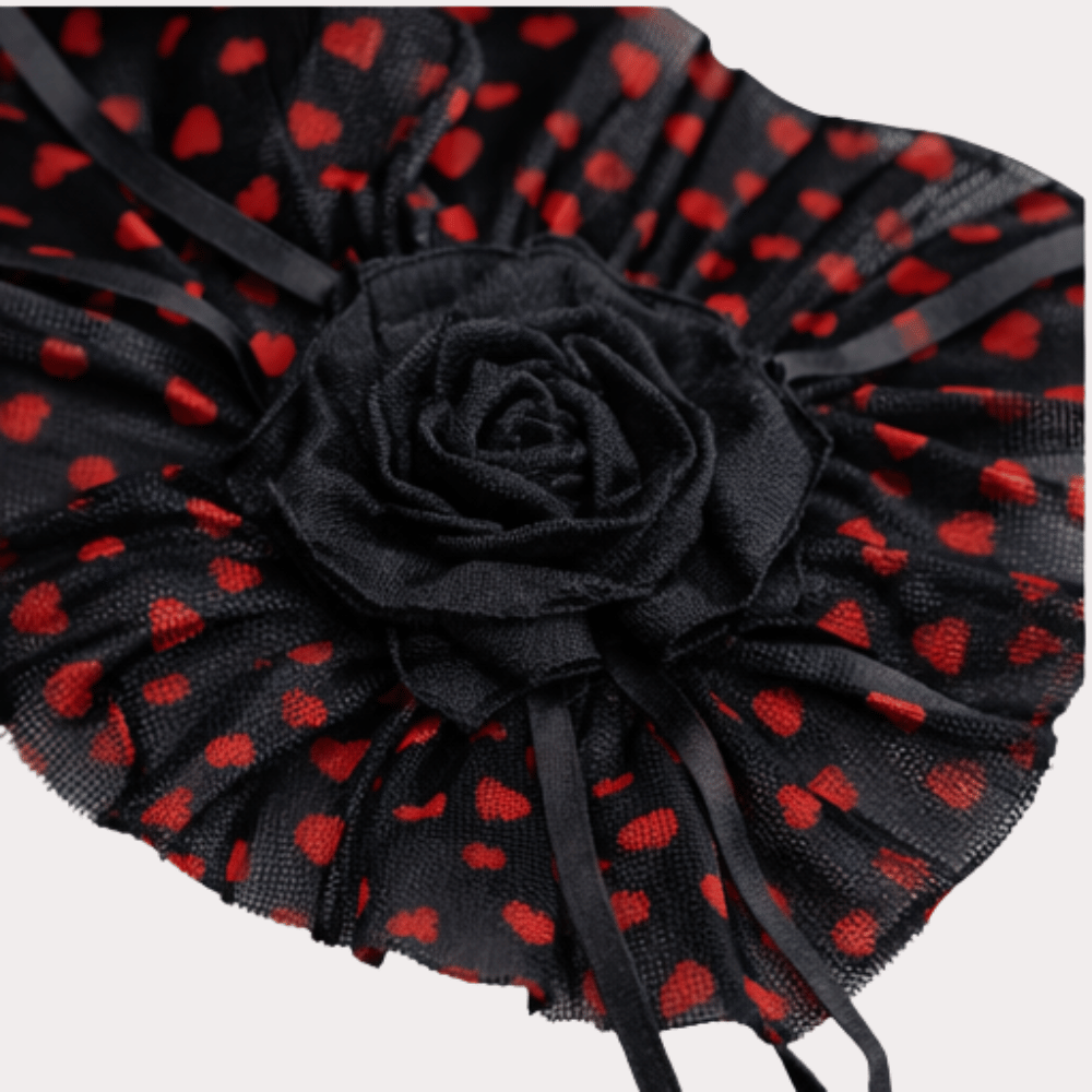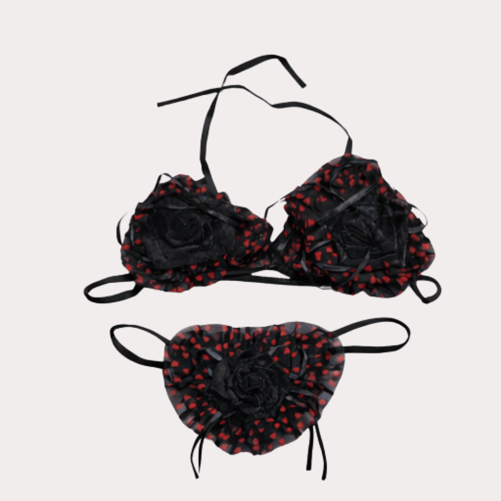A bold and playful lingerie set featuring sheer black mesh, red heart patterns, and statement rose detailing for a romantic yet seductive look.