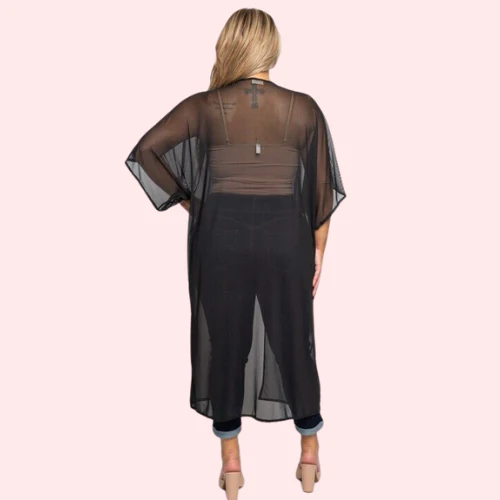 The Plus Size 5XL-6XL See-Through Black Robe, designed to make you feel elegant and comfortable. Made from soft, breathable mesh fabric, it drapes beautifully over your curves. The robe has an open front, perfect for showing off your favorite lingerie or wearing alone. A silky satin tie at the waist lets you adjust the fit, highlighting your shape. Lace details on the hem and sleeves add a touch of luxury. The see-through material gives a hint of what’s underneath, making it perfect for special evenings. This robe is made to make fuller figures look and feel great. It’s a must-have for relaxing at home or a romantic night.