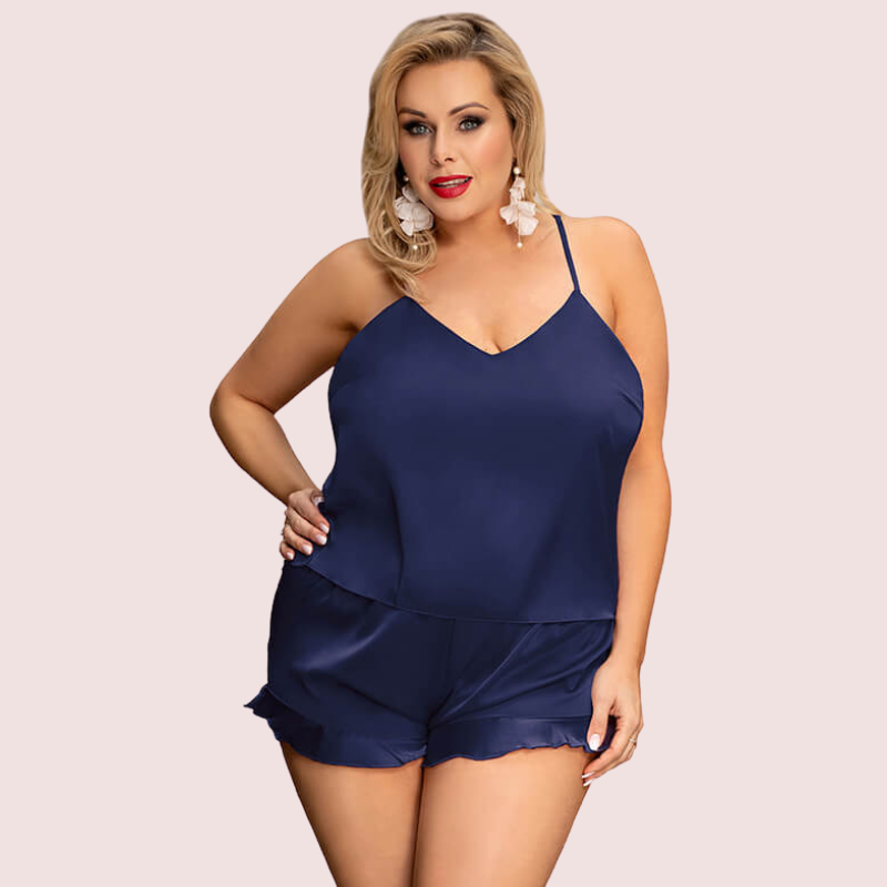 Our Plus Size Cami Top and Shorts Nightwear Set, designed for comfort and style. This set features a soft, breathable fabric that feels great against your skin. The cami top comes with adjustable straps for a perfect fit, while the matching shorts have an elastic waistband for added comfort. Perfect for a cozy night in or lounging around the house, this nightwear set combines practicality with elegance.