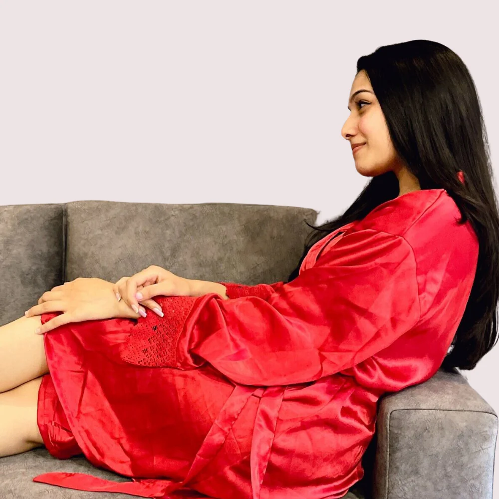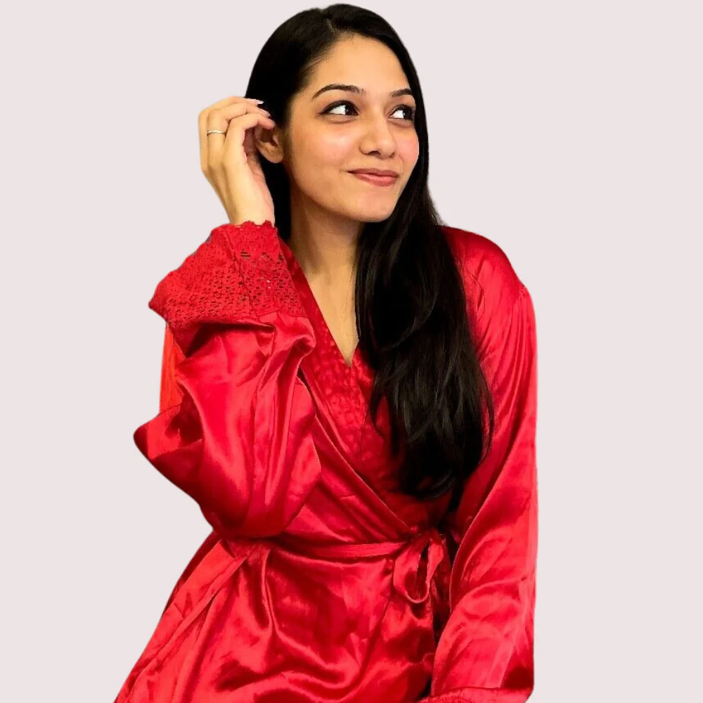 Introducing the Red Silk Satin Robe with Elegant Lace Trim. This robe is made from smooth, high-quality silk satin that feels soft and luxurious. The rich red color looks sophisticated and attractive. Beautiful lace trim decorates the sleeves and hem, adding a delicate touch. The robe wraps comfortably around you and has a matching silk belt to tie at the waist for a flattering fit. It's perfect for relaxing at home or for special evenings. The lightweight fabric drapes nicely, keeping you cool and comfortable. Add a touch of elegance to your lingerie collection with this stunning red silk satin robe.