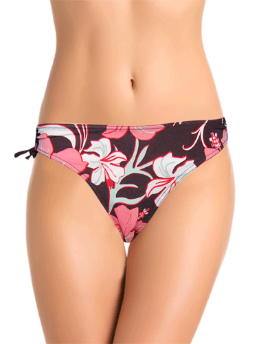 Soak up the sunshine in this Rodeo Hibiscus Print Side Tie Bikini Bottom with its hibiscus flower design and dark brown detailing for an effortless beach look. The bikini bottom and thin tie side straps offer minimal coverage that is ideal for long afternoons of sun bathing. Complete the look with the Snazzyway Bustier.