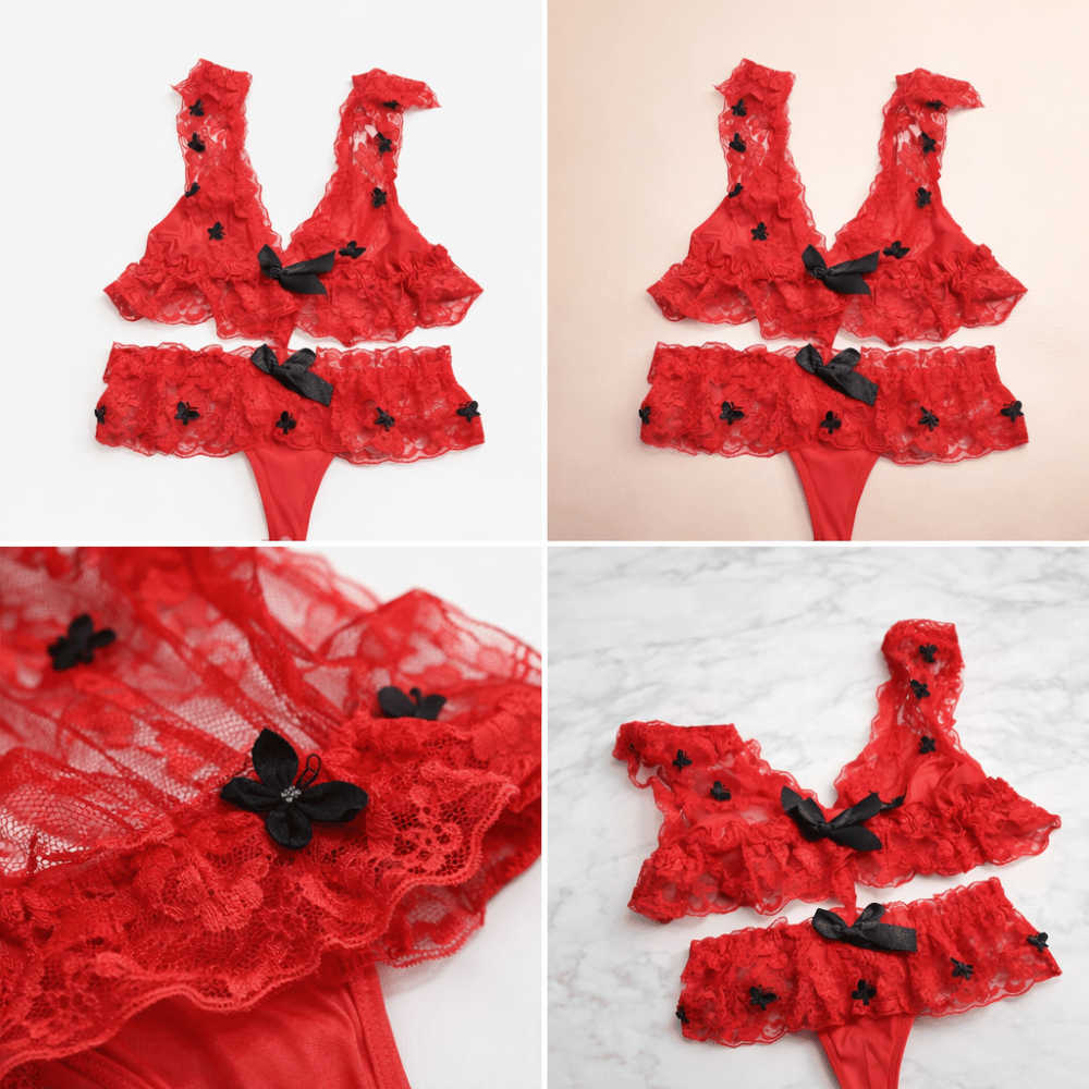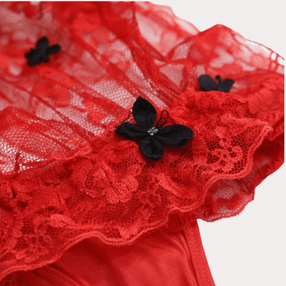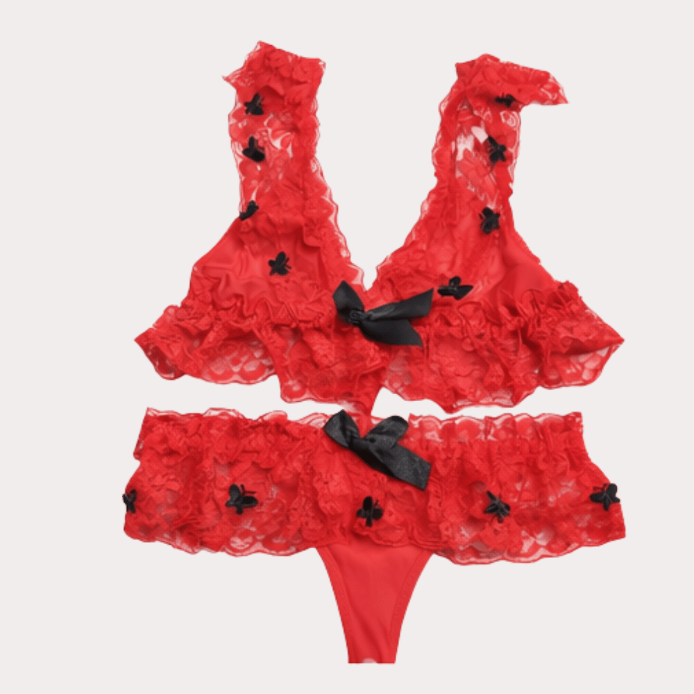 Romantic red lace lingerie set with layered ruffles, delicate black floral accents, and a soft, feminine silhouette.