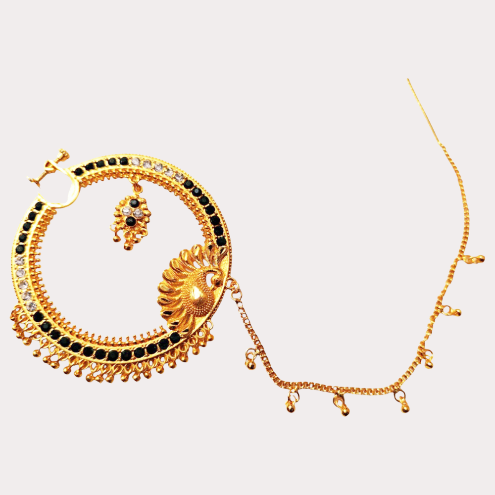 Royal Sun Design Bridal Nath with Chain – Gold-Toned Black and White Stone Nose Ring