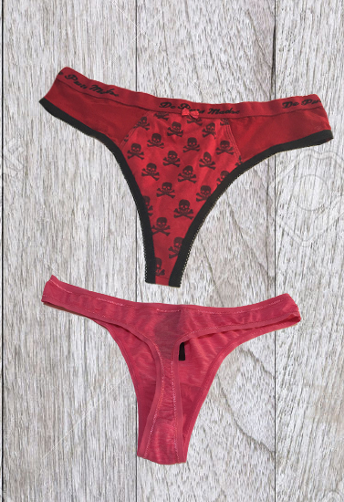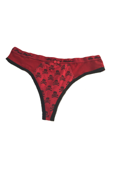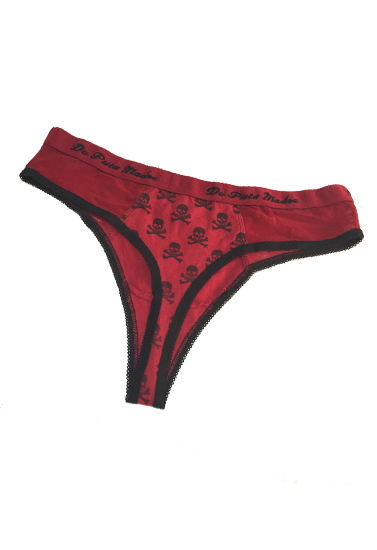 Stay comfortable throughout the day with this red cotton thong. Thong is made of 90% cotton and 10% spandex for a soft and secure fit. This thong panty has skull print and stretchy net at both sides. Elastic on waistband with the print of brand name. The crotch lining is also secured with black elastic. This is highly breathable so you'll stay cool on hot days.