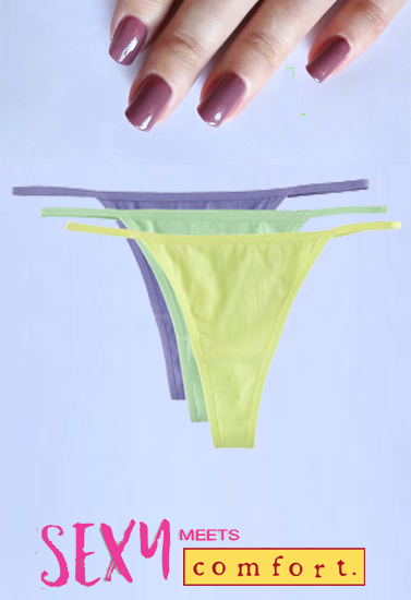Hide panty lines with this Sexy Seamless G-String Cotton Thongs, offer all-day comfort and available in 3-Pack for extra value. Featuring a soft and breathable stretch cotton construction, these thong panties also have a bit of spandex that highlight your curves and provides a secure fit. The elastic waistband is covered and won't feel abrasive on your skin, and the inner is tagless for additional comfort. These cotton thongs have a low-rise profile, so they won't peek over your waistline. The edges lie flat against your body and provide no panty lines. The panties are available in assorted colors, and each 3-pack includes three different colors, so you're sure to have a pair that works with your ensemble. Comfortable as an everyday panty and so light feel as if you're not wearing anything!- 90% cotton, 10% spandex
