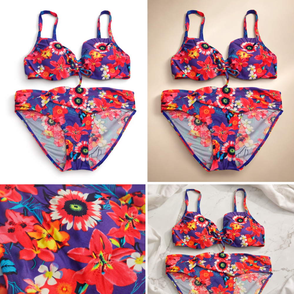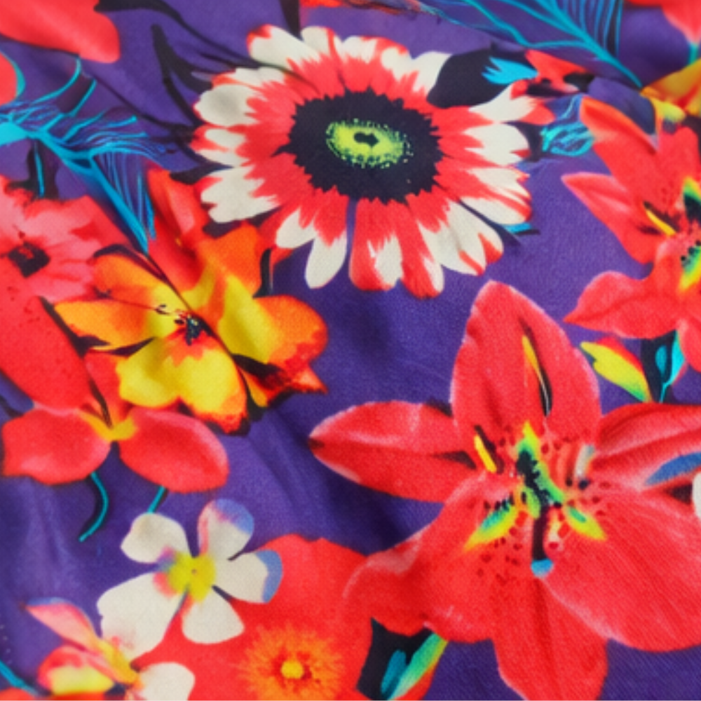 Make your beach days brighter with this stunning floral tie-front bikini set. Designed with a rich royal purple base and vibrant red and multicolor tropical blooms, this two-piece swimwear blends bold style with flattering comfort.