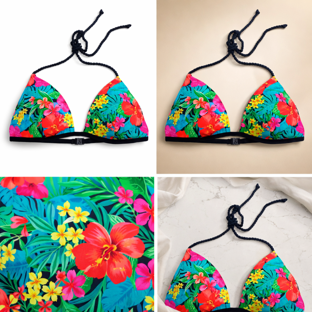 Bring vibrant island vibes to your beach look with this stunning tropical floral bikini top. Designed with a classic halter neck tie-up style, this swimwear top offers adjustable support and a flattering fit for all body types.
