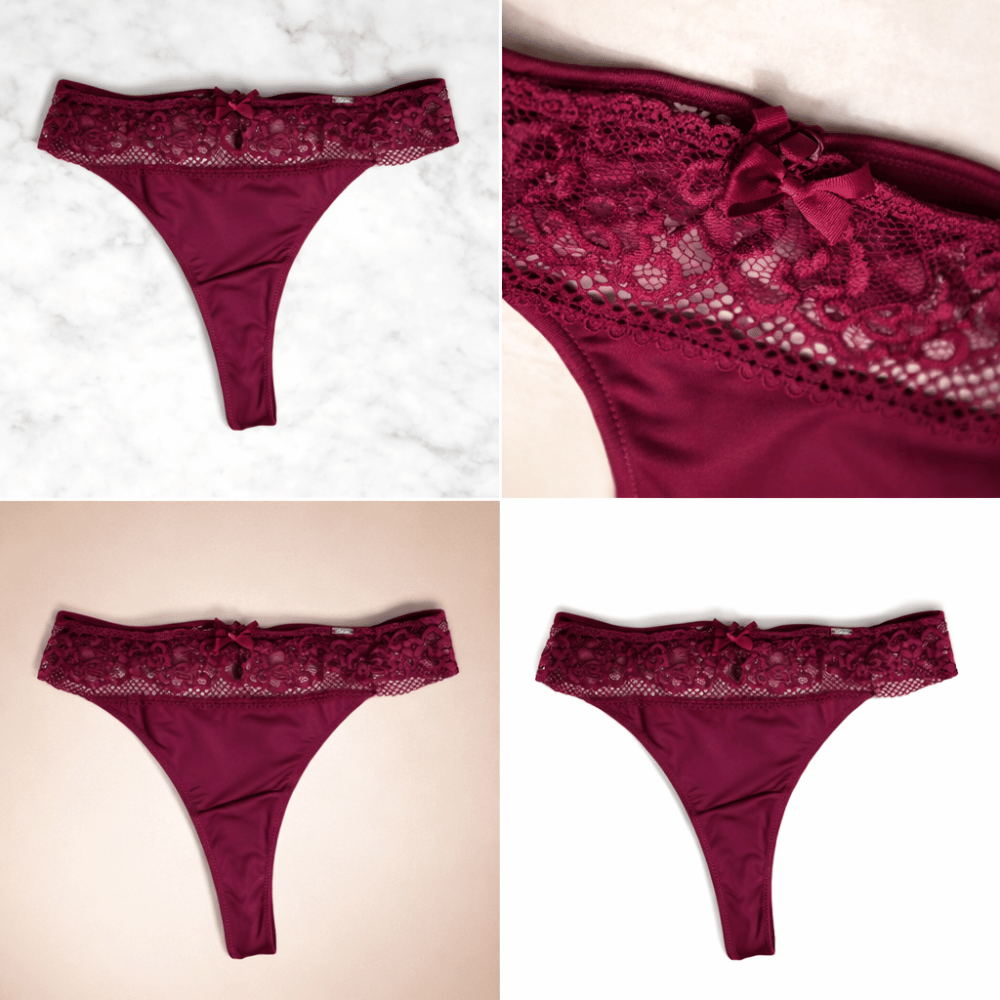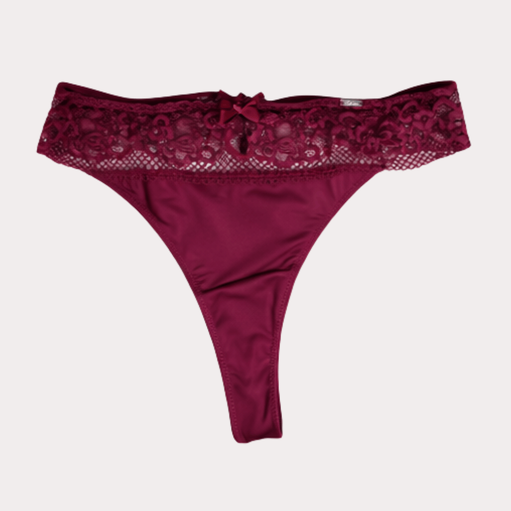 Elegant wine red thong panty featuring delicate lace waistband and a soft satin body for a smooth, comfortable fit.