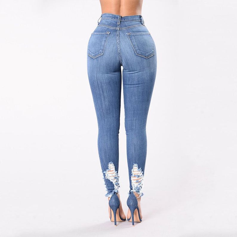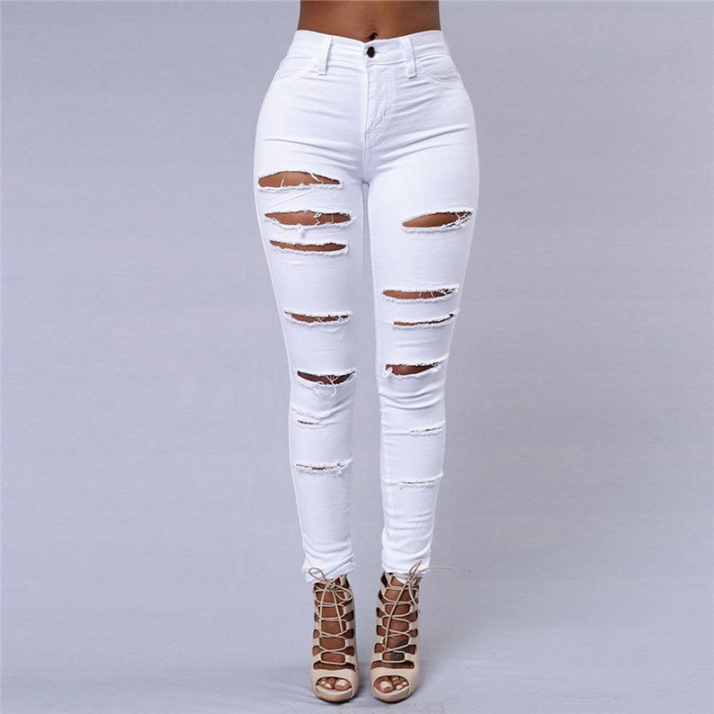 Women Fashion High Waist Solid Color Elegant Ripped Jeans